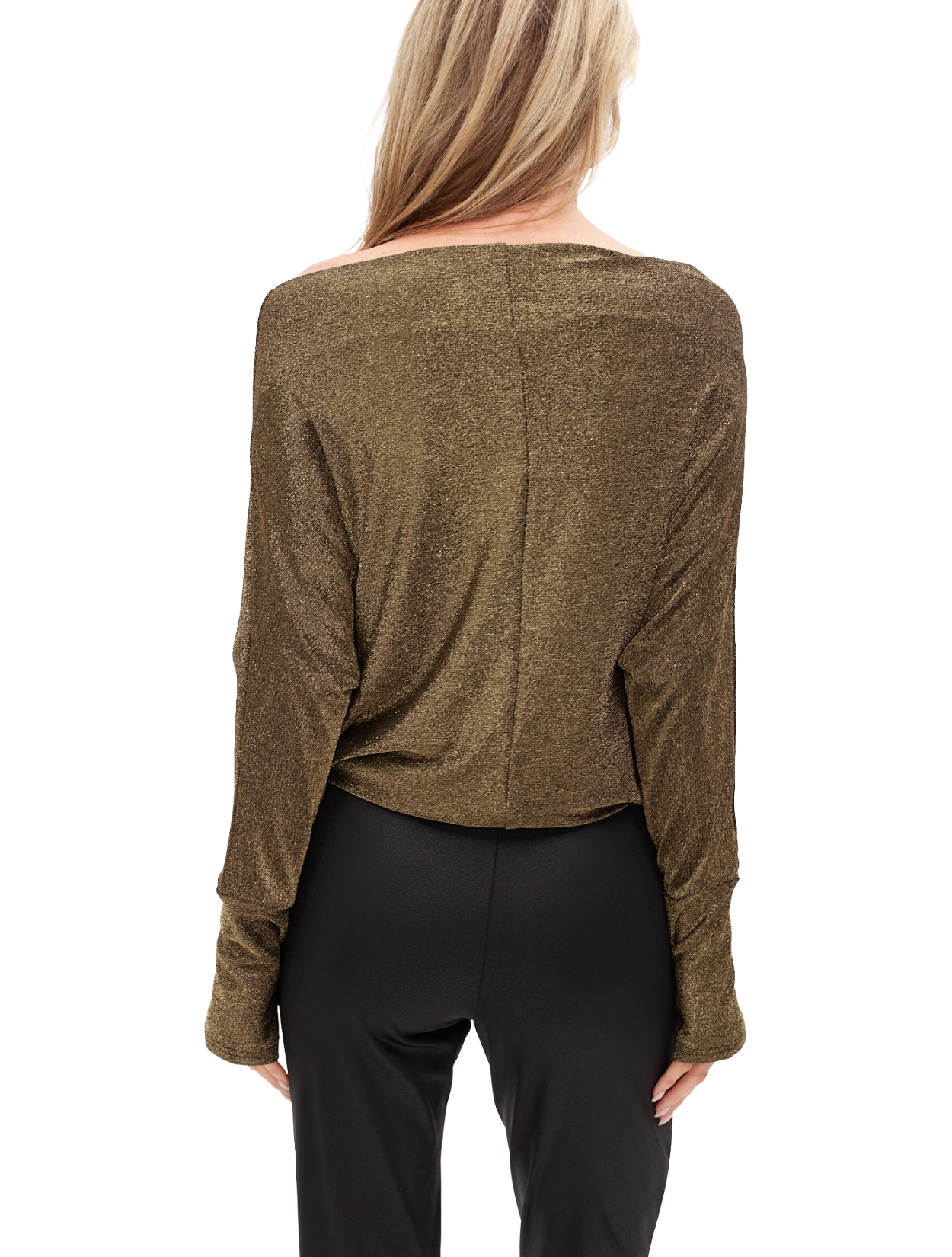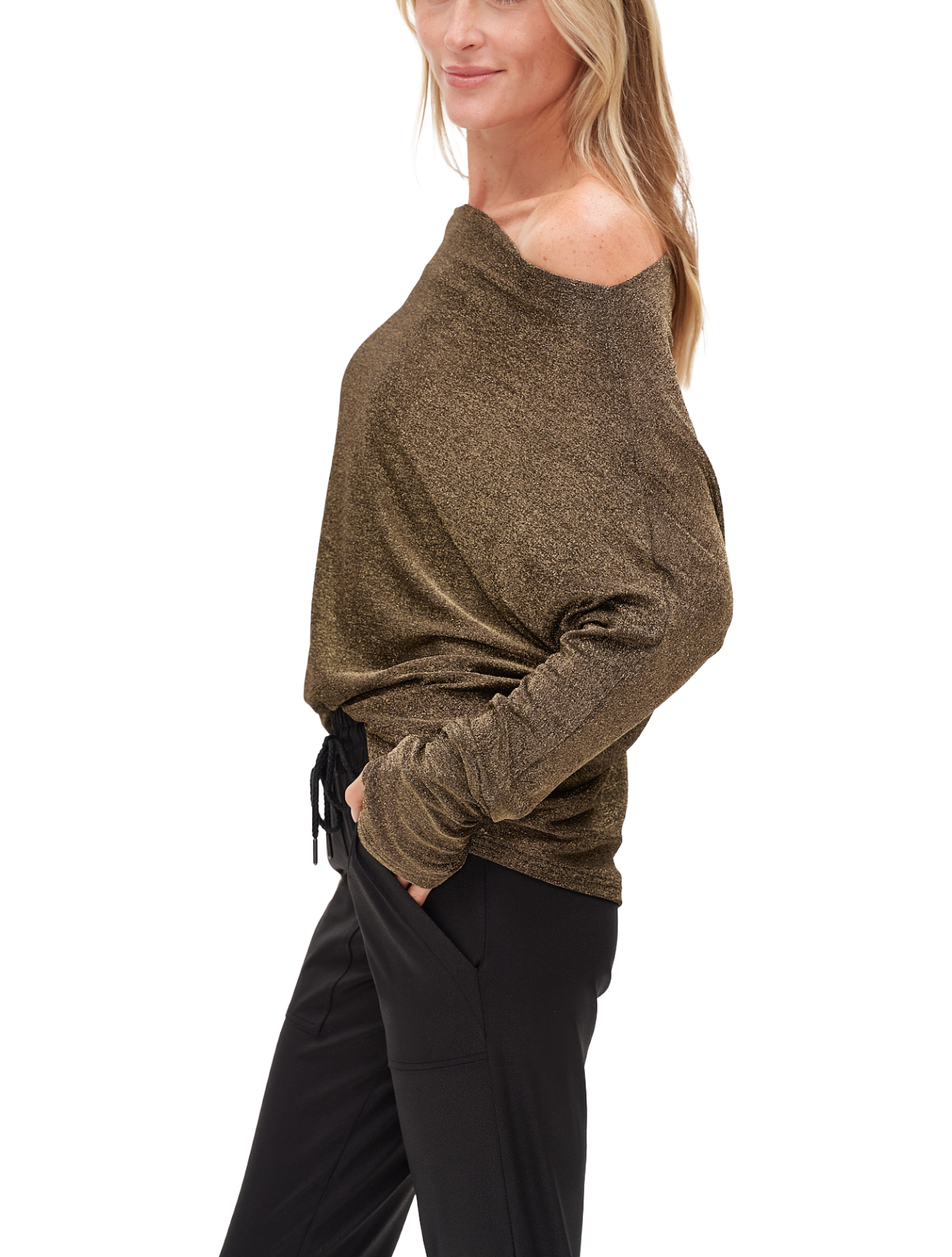 Slouchy off the shoulder long sleeve solid metallic lurex top.