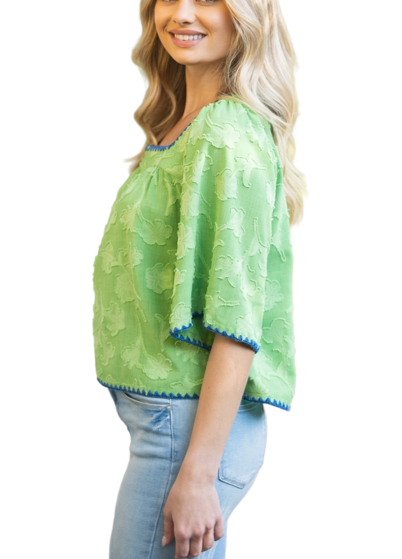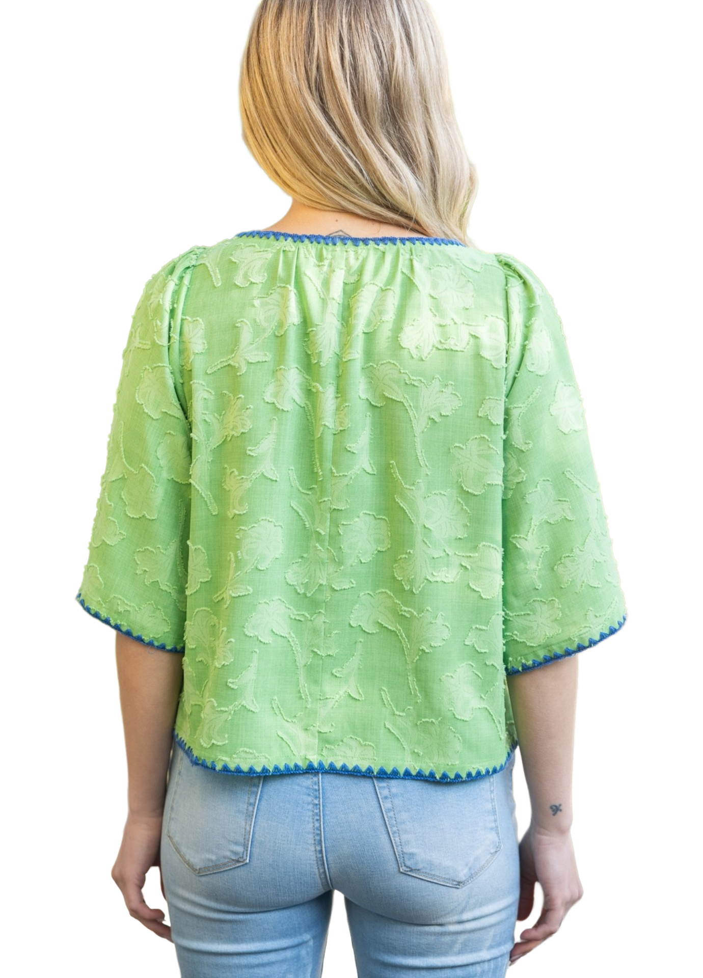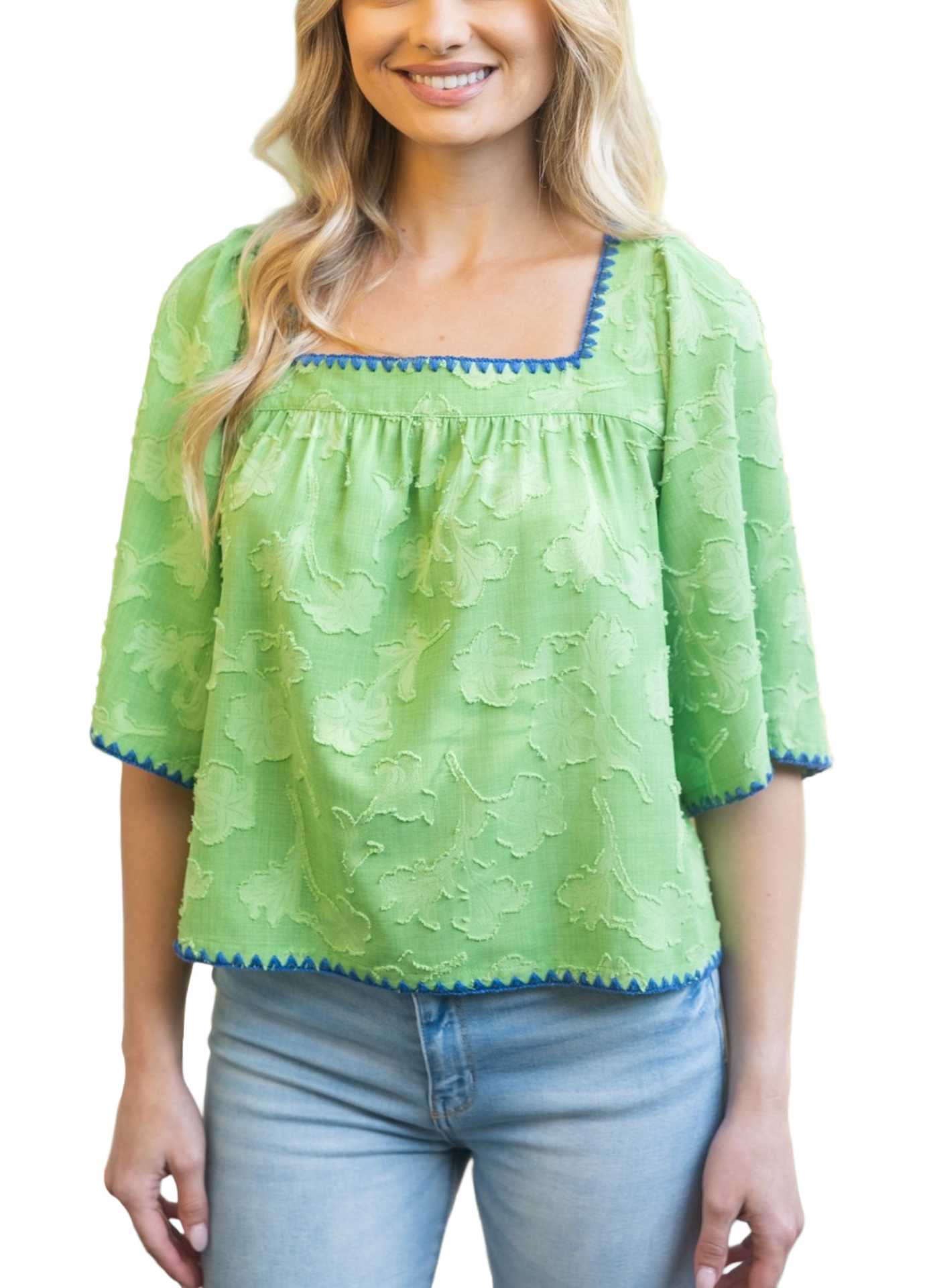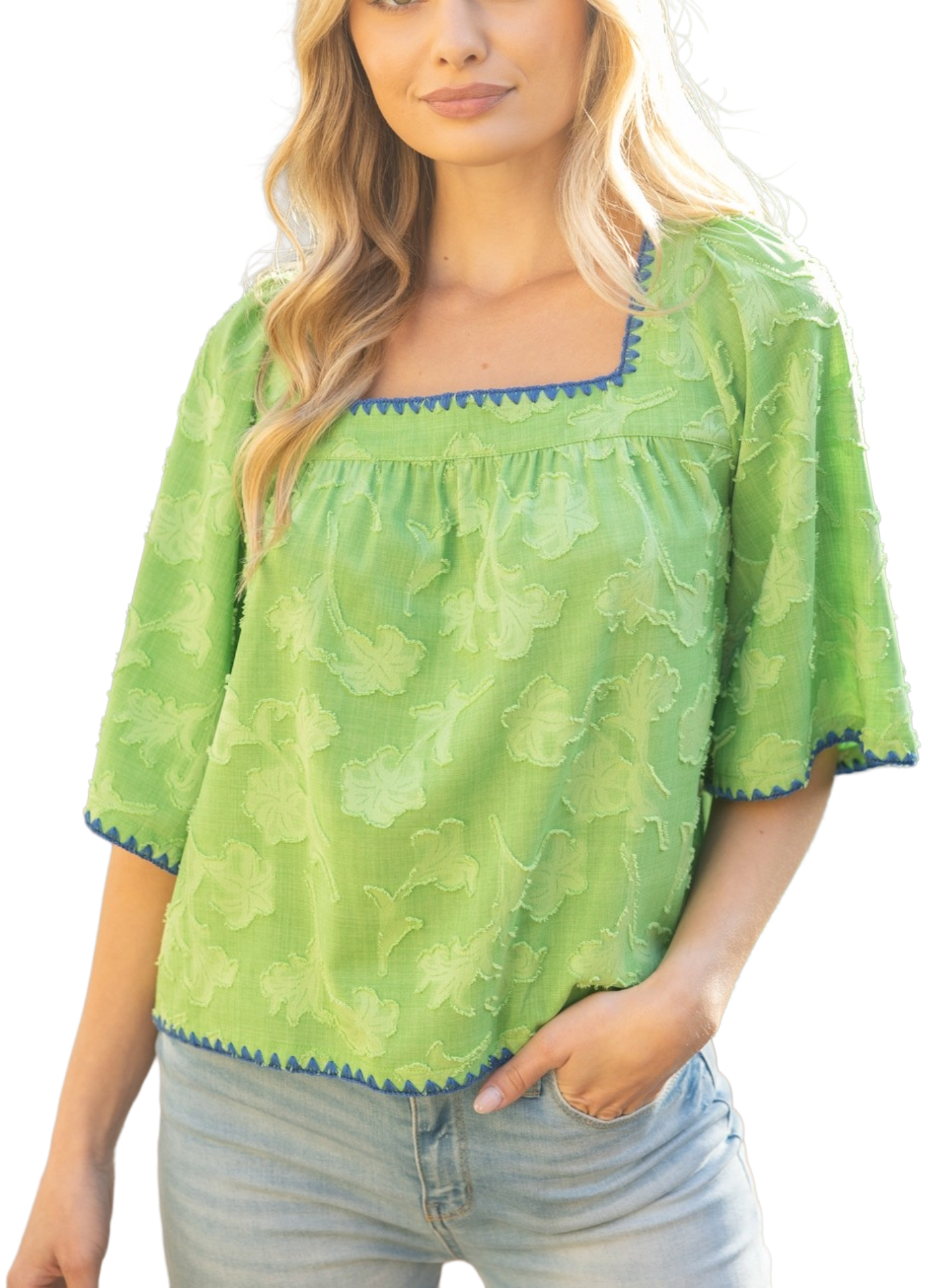 Square neckline - Three quarter wide flowy sleeve - Contrast color embroidery detail - Lightweight floral textured fabric