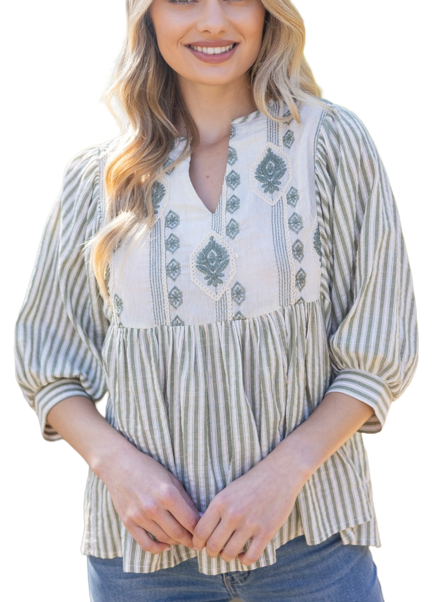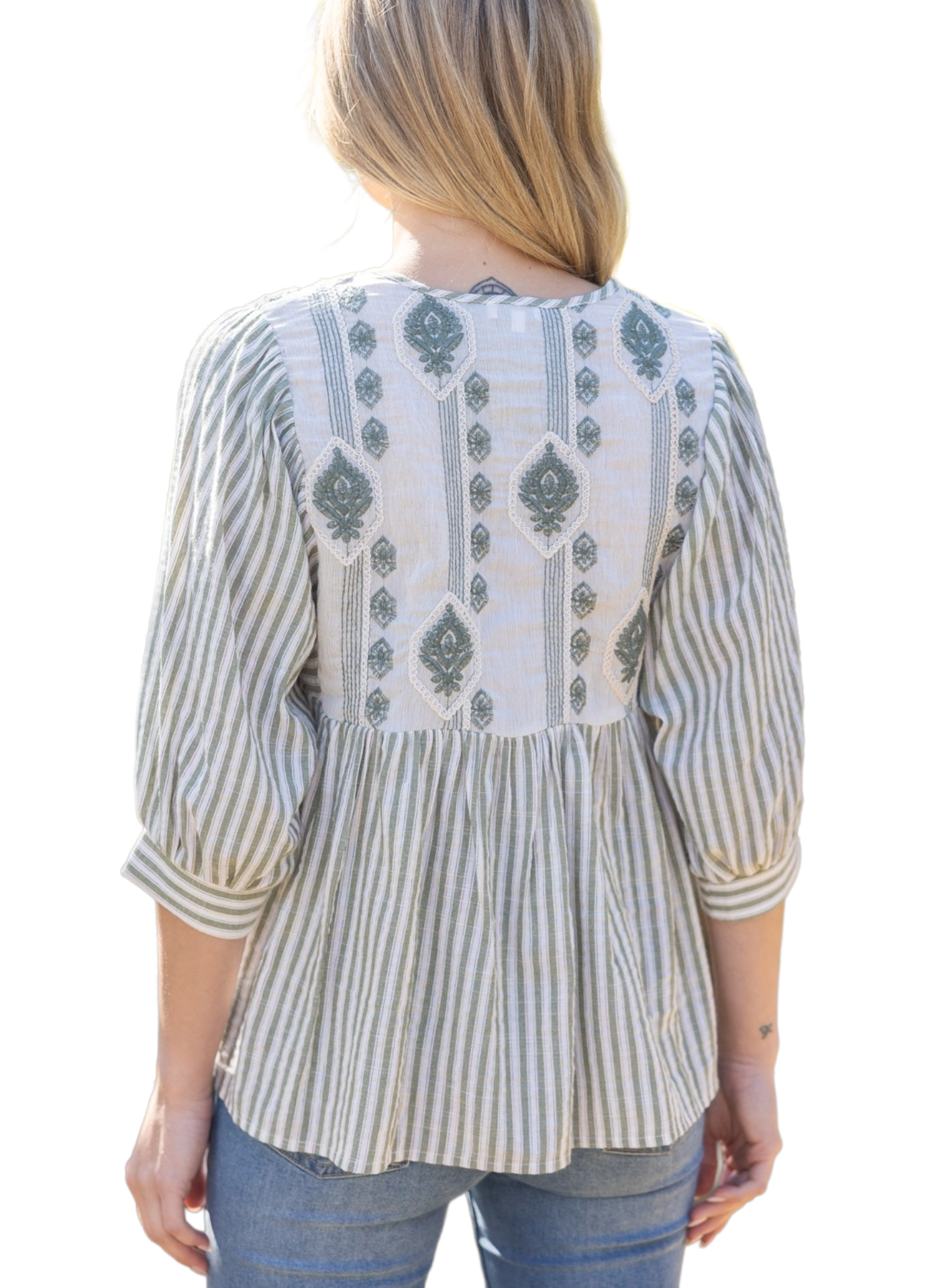 V-neckline - Half length puff sleeve - Embroidered front and back yoke detail - Stripe and embroidery mixed cotton fabric