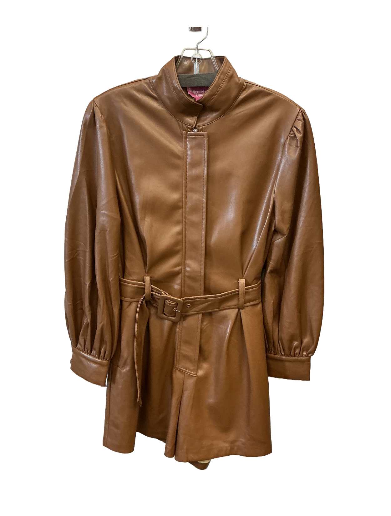 Super soft Vegan leather romper feat. long sleeves, front zip, belt, side pockets, buttons at cuffs
