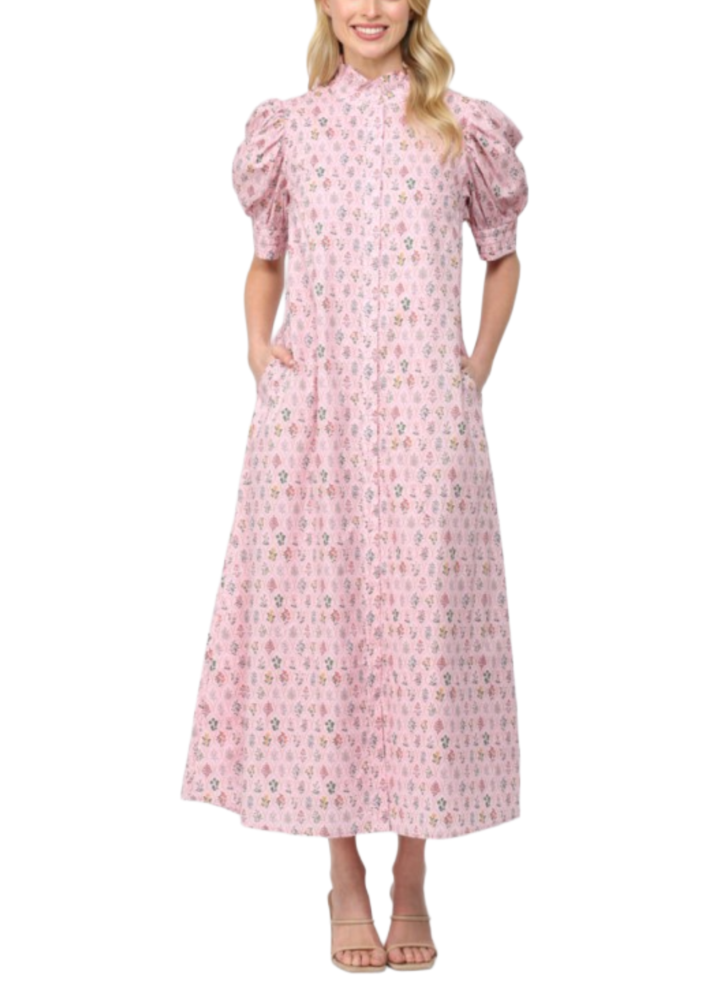 Floral Ruffled Mock Neck Button Down Maxi Dress.