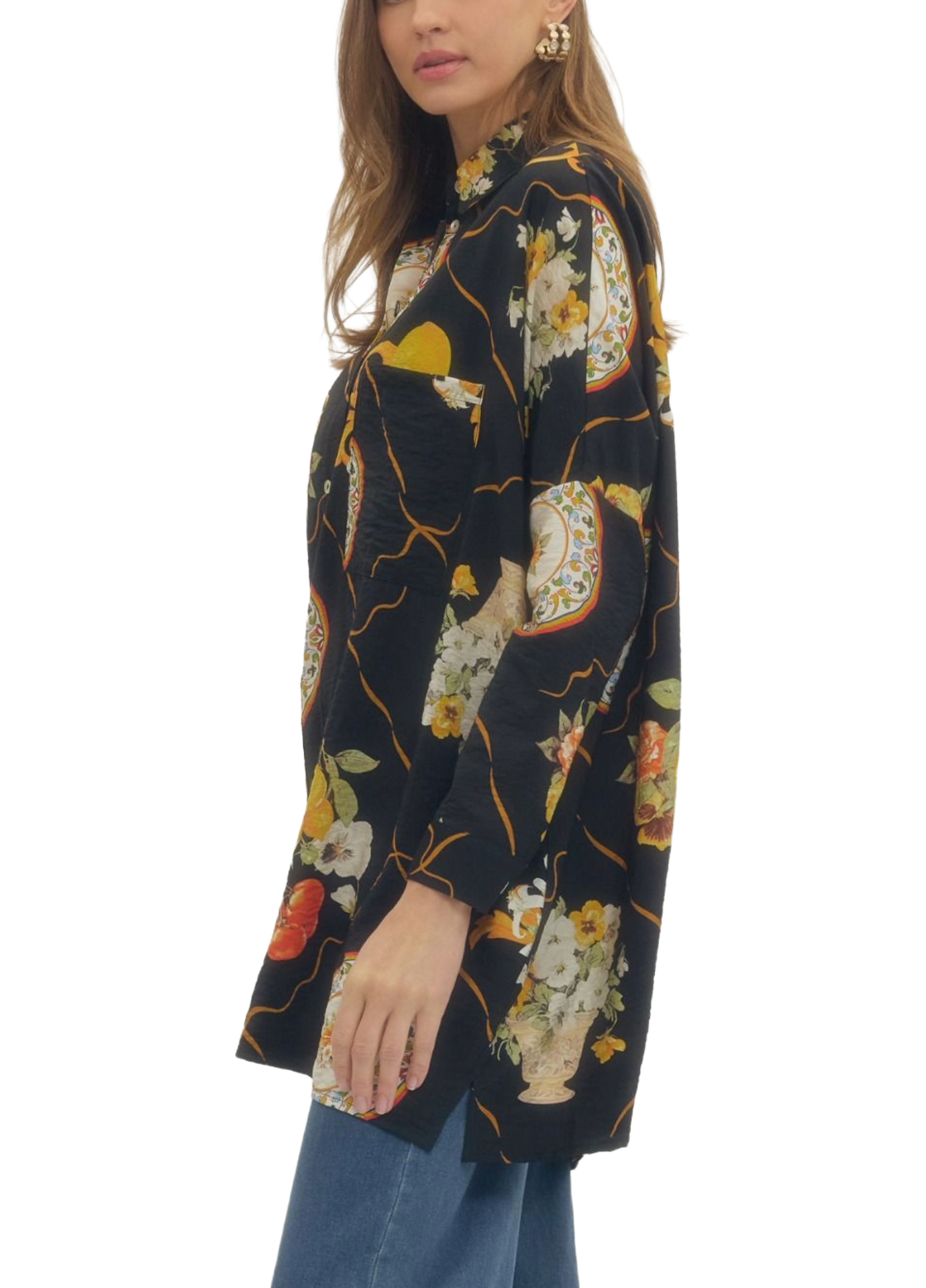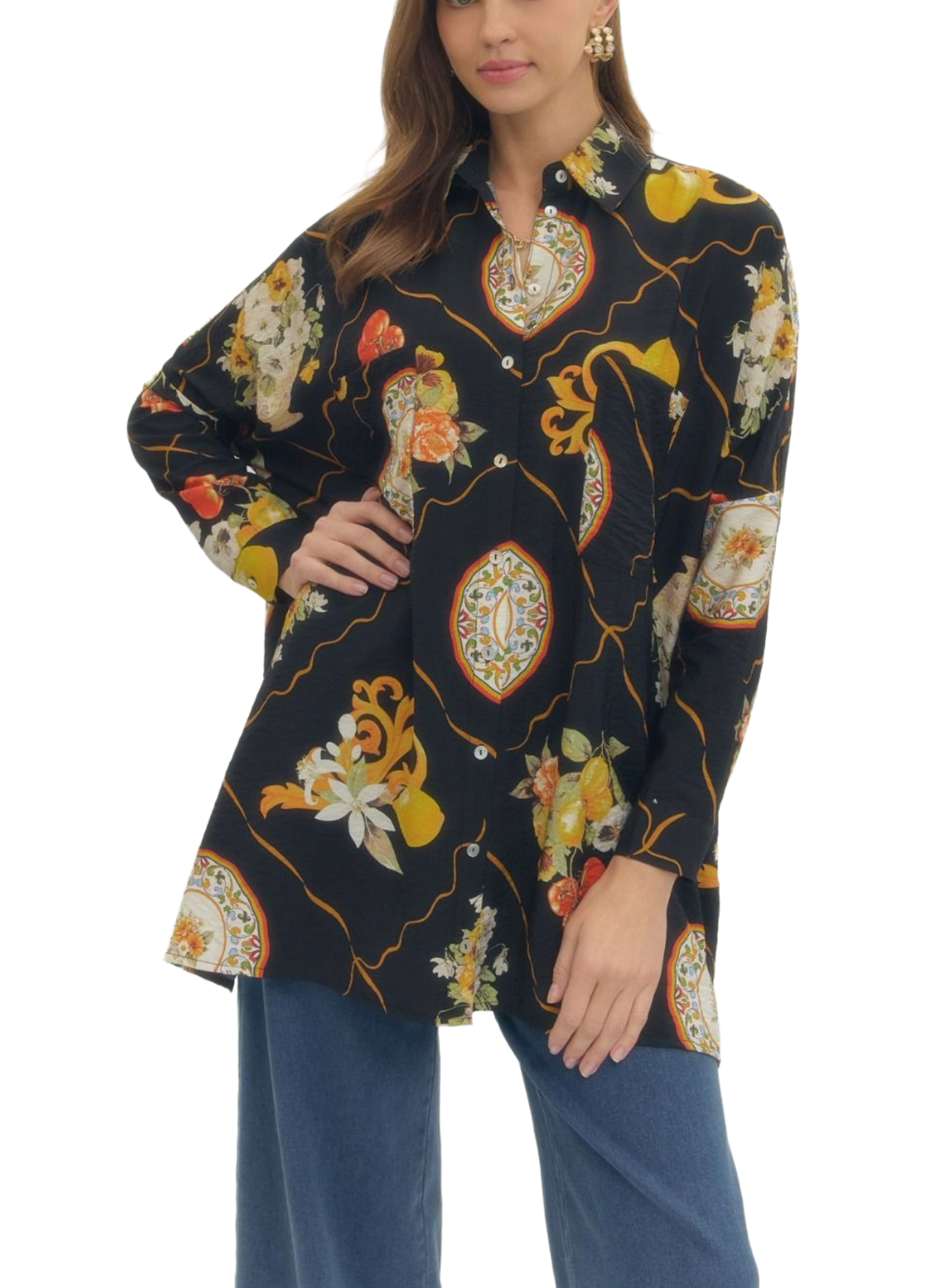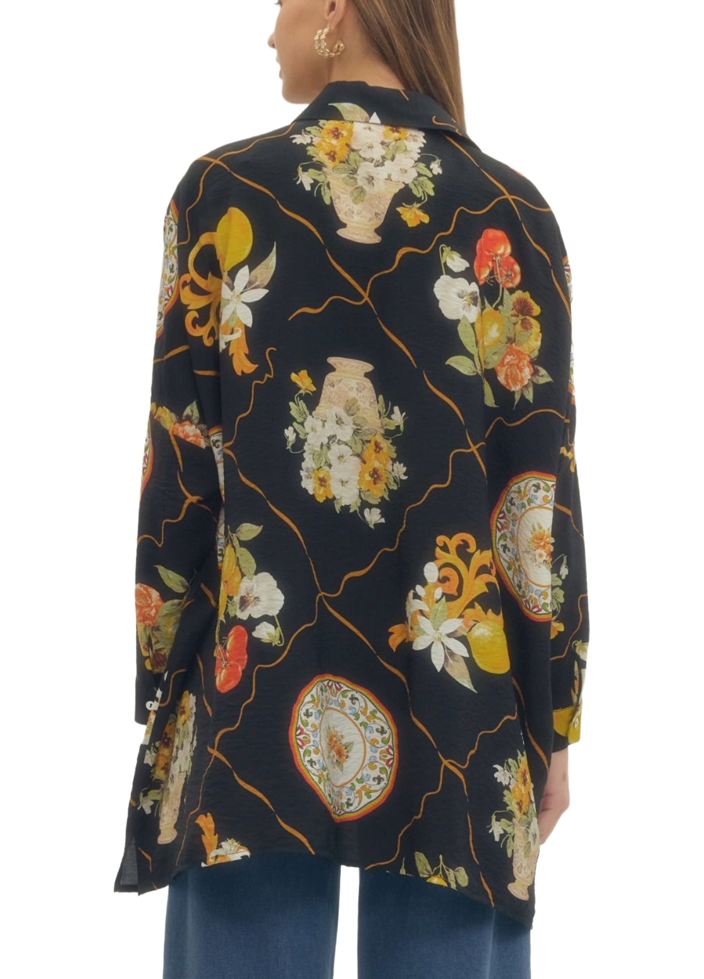 Tile print long sleeve top featuring band collar with V-cut opening and buttoned cuffs. Unlined. Woven. Non-sheer. Lightweight.