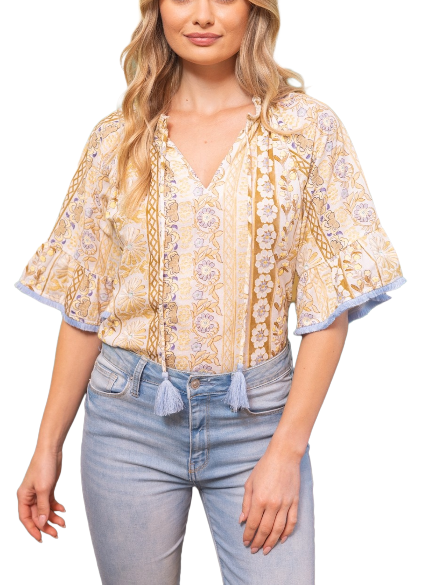 V-neckline with ruffle detail - Half wide sleeve - Fringe detail on sleeve - Front tassel self spaghetti strap tie - Floral print and embroidered woven fabric