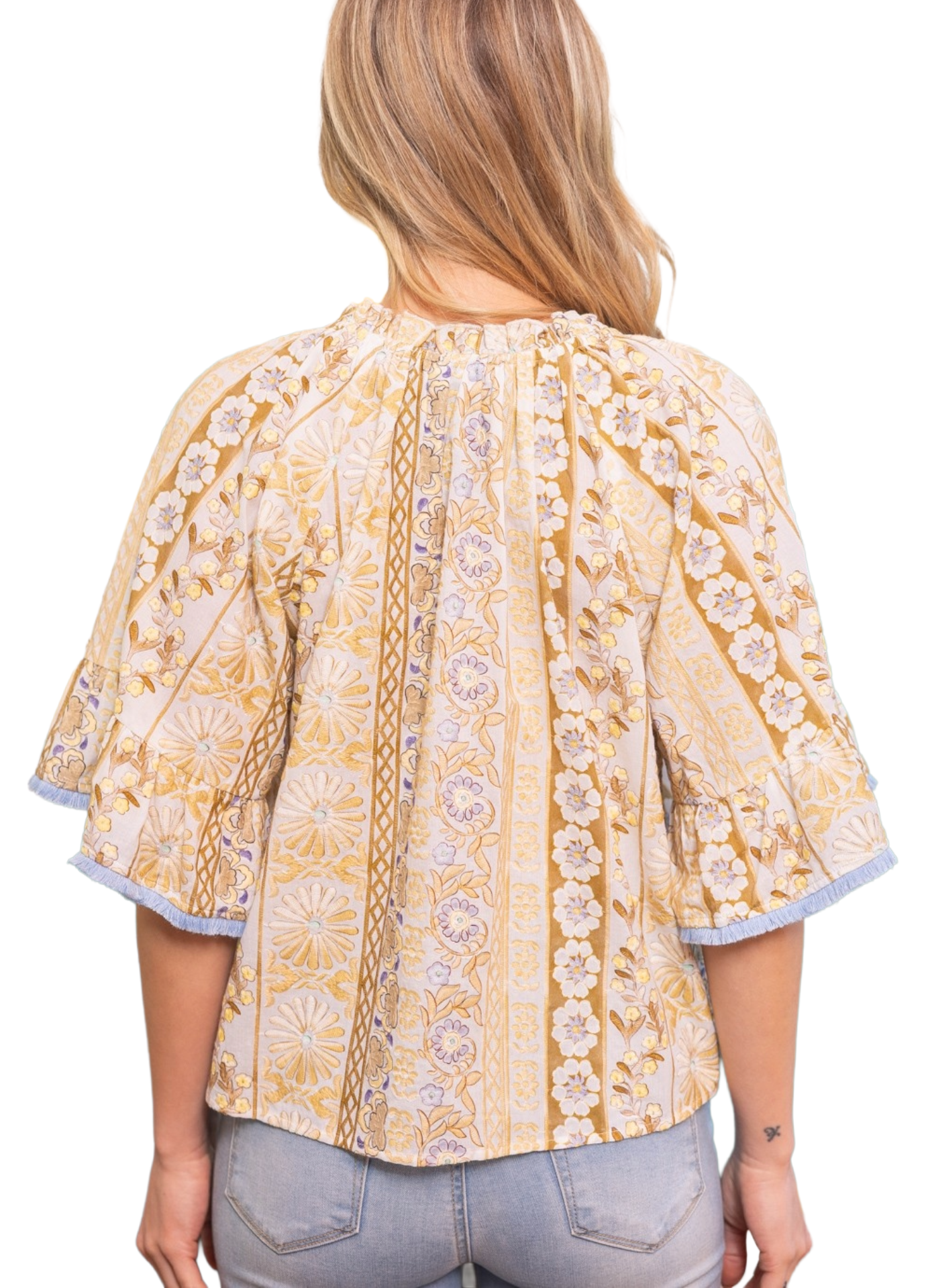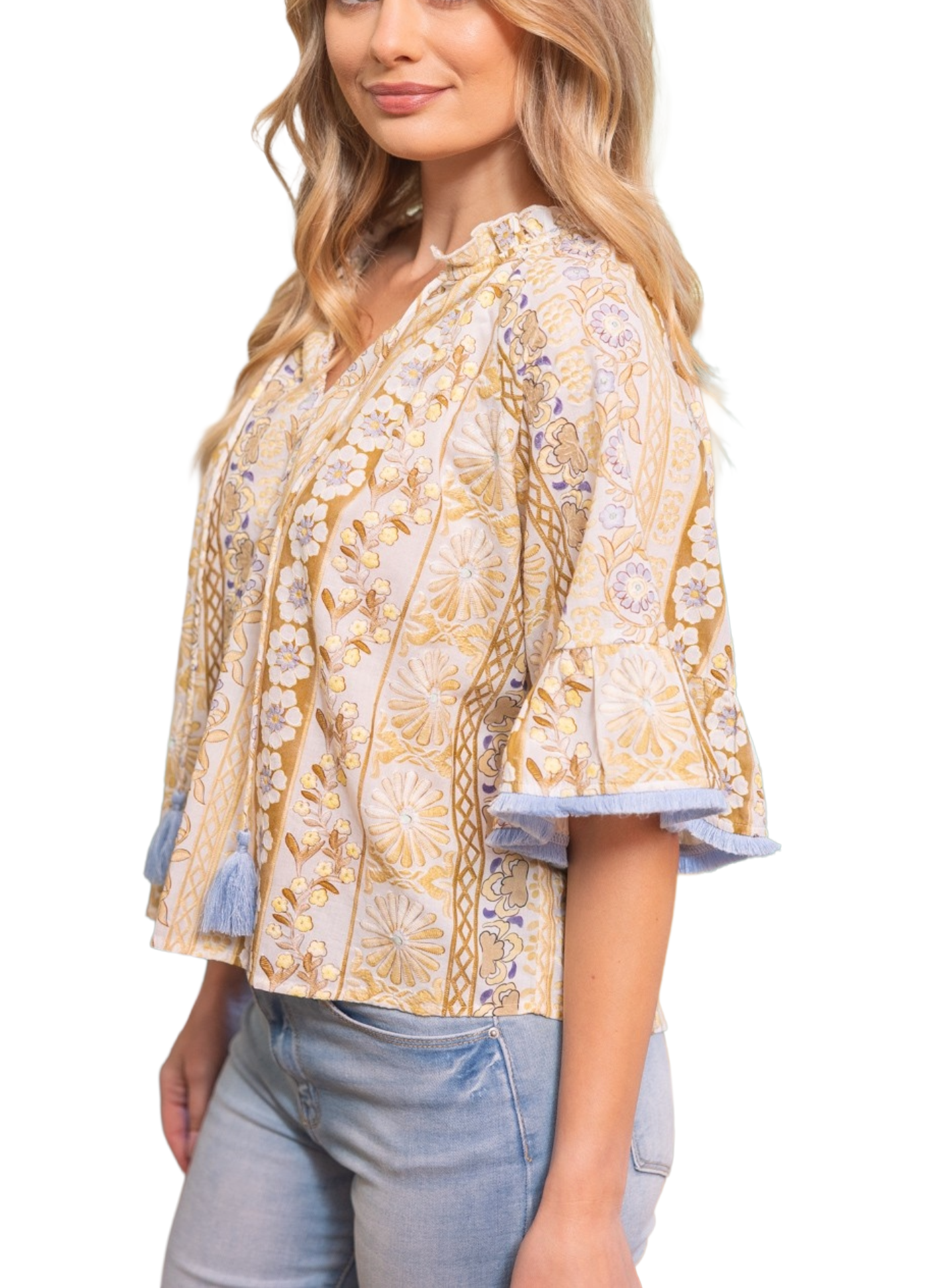 Fringed Detail Tassel Front Floral Embroidered Top.