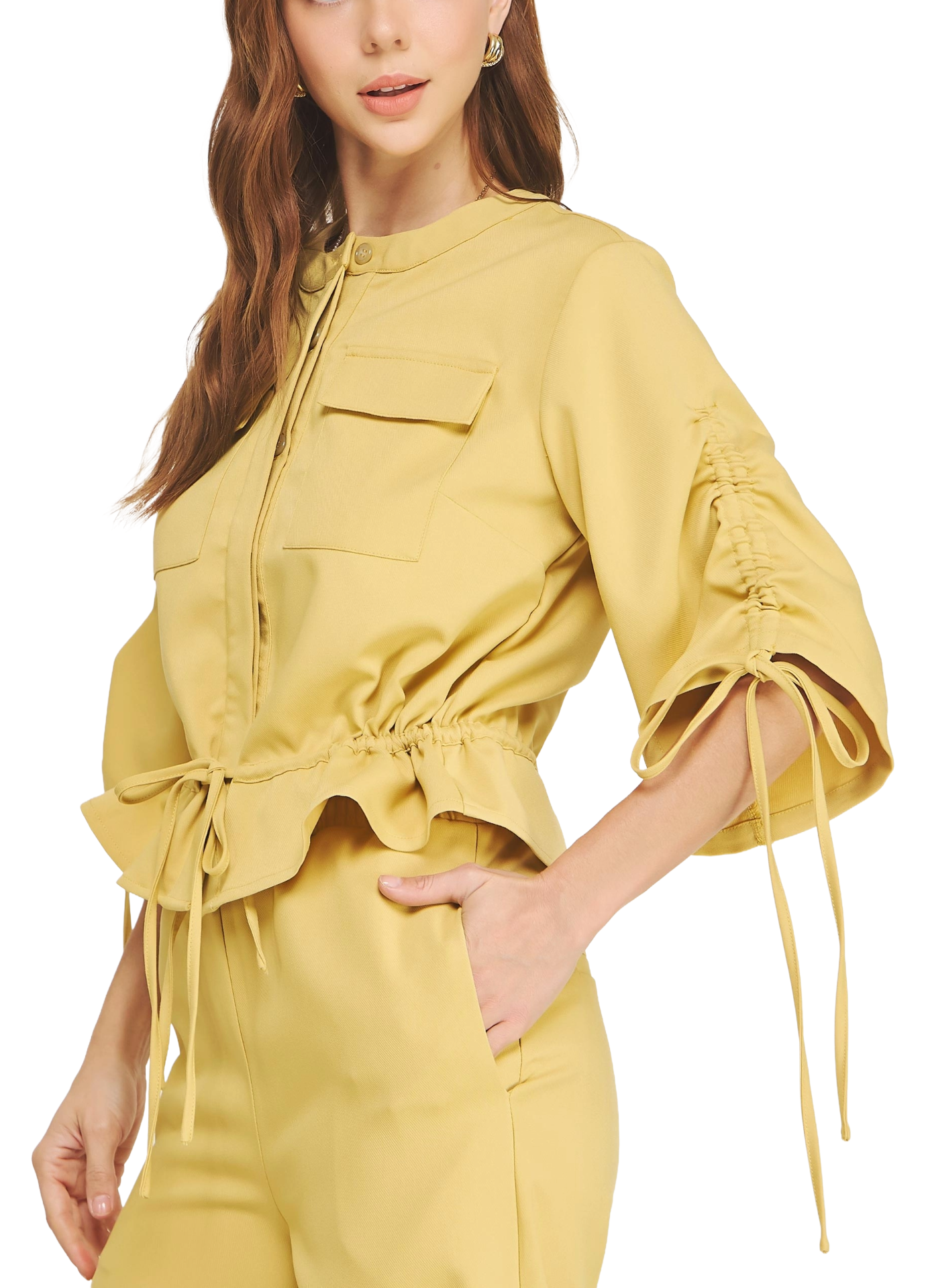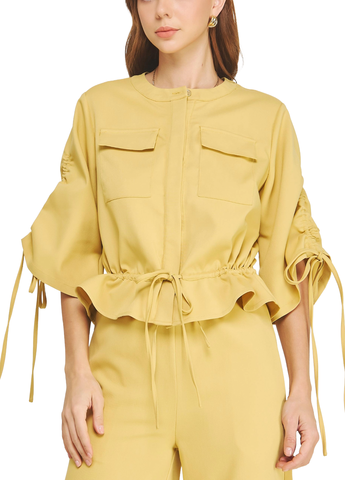 1/2 sleeve ruching detail top jacket in stretch suiting fabric. This style features a round neck, button down placket closure at front, cinched waist with adjustable drawstring tie, 1/2 sleeve with adjustable drawstring detail, and chest flap pockets.