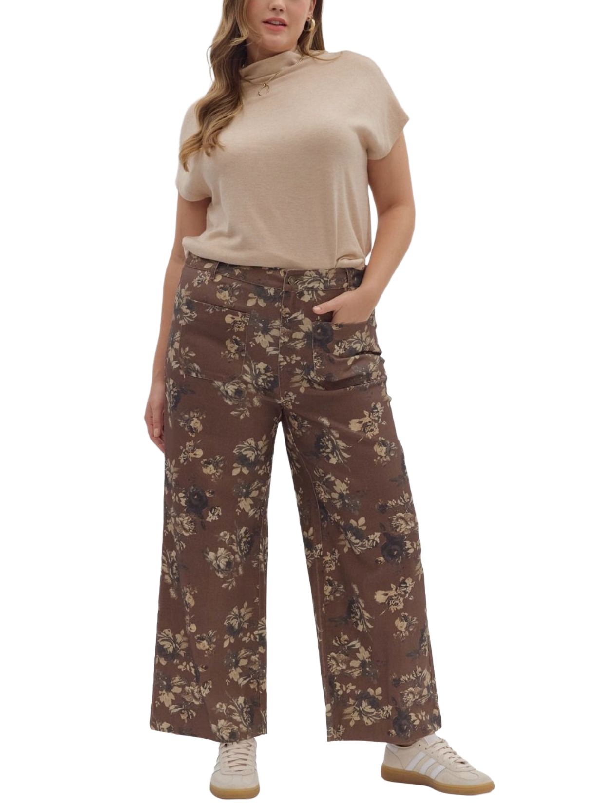 Plus Size Floral pattern mid-rise ankle-length pants. Button zip-fly closure at front. Patch pockets at front and back. Unlined. Woven. Non-sheer. Lightweight. 95% cotton 5%span