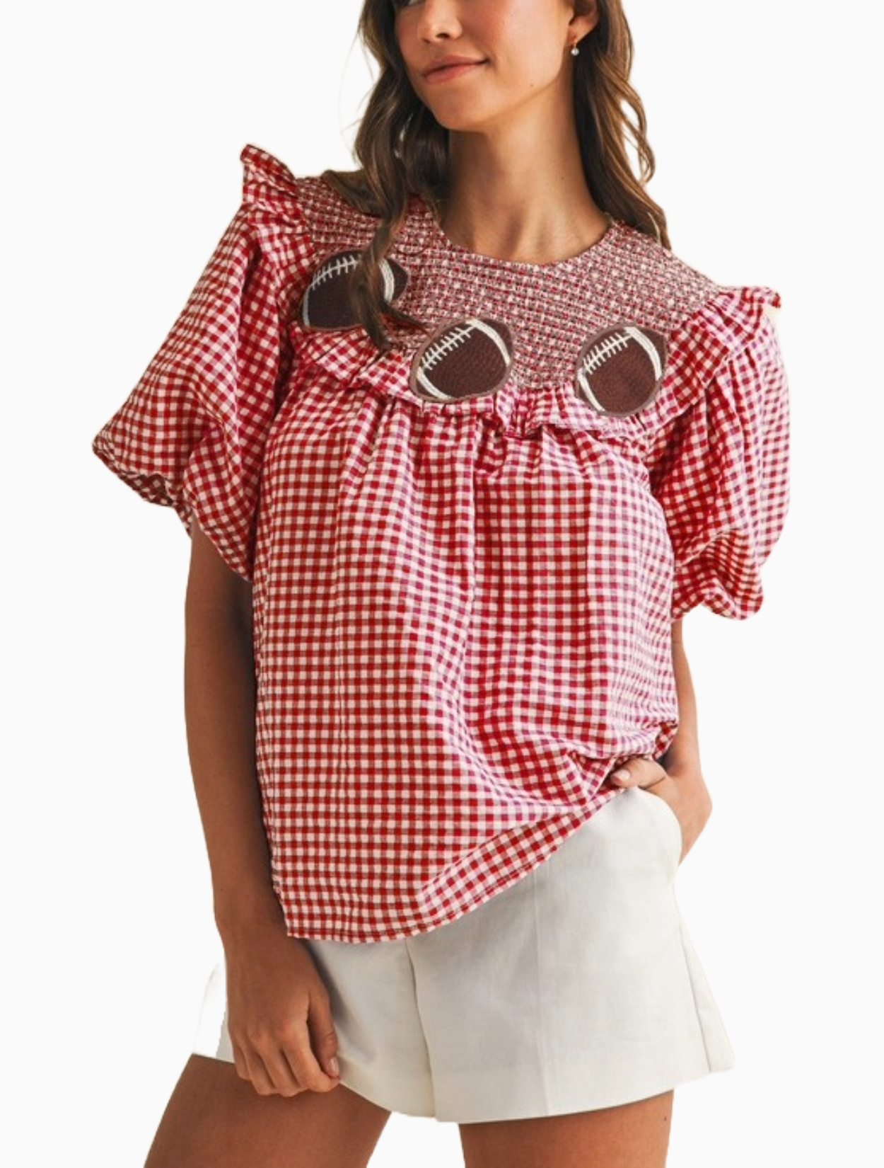 Lightweight football-themed blouse featuring smocked detail, embroidery, and balloon sleeves on gingham check fabric. Designed with a swing hem and keyhole back for a comfortable, loose fit.