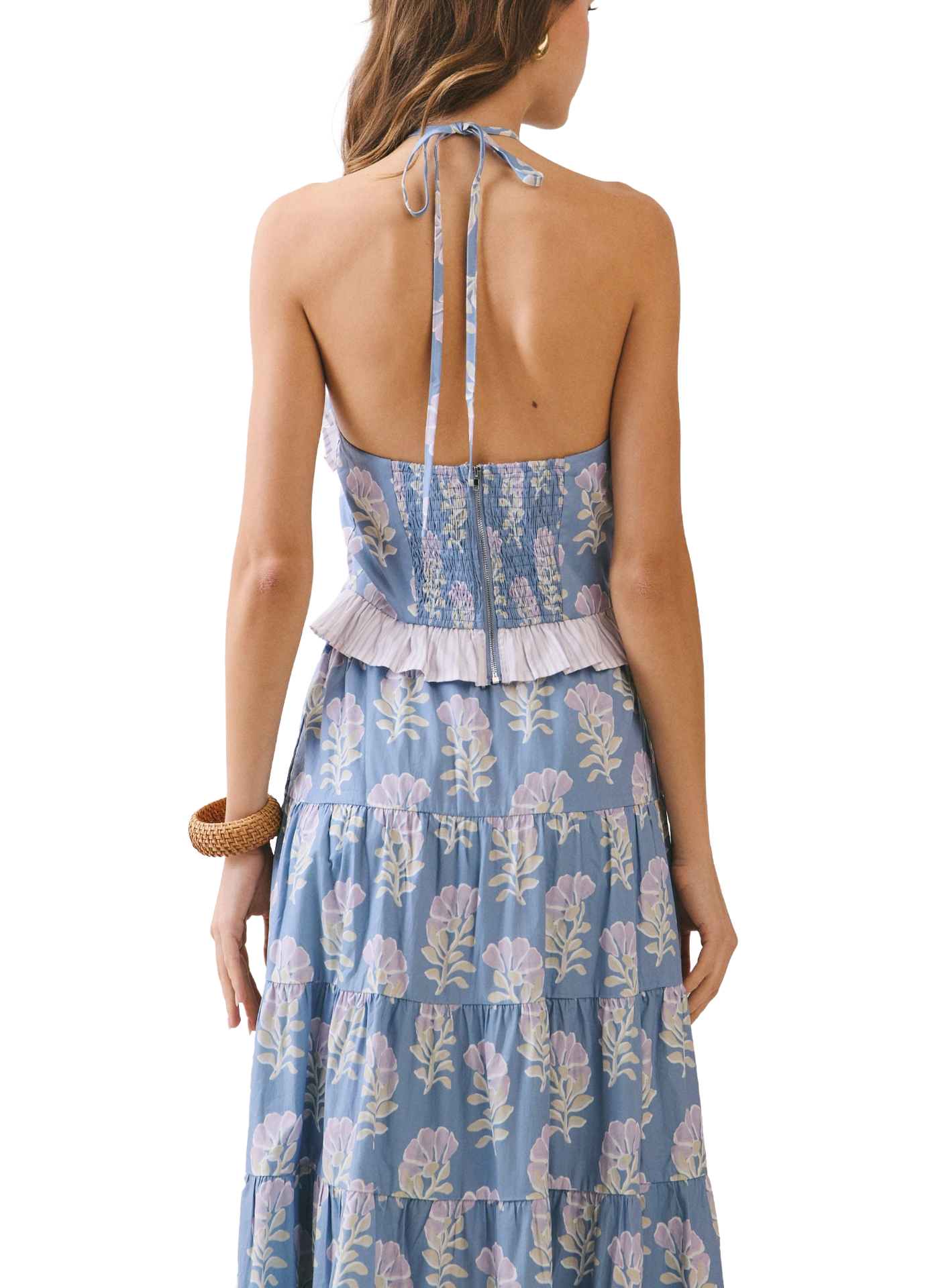 A floral-print halter top featuring a keyhole neckline accented with contrast ruffle trimming. Designed with a smocked back panel for a peplum-style ruffle hem. Completed with an adjustable tie-back halter strap and a back zipper closure. 100% cotton.