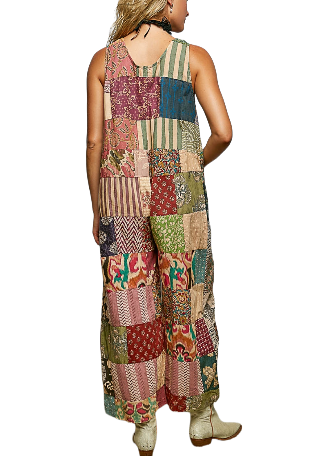 V-neck sleeveless jumpsuit designed with a roomy fit, crafted from printed woven fabric. Featuring varied patchwork construction, dual patch pocket detailing, and a front button closure, this piece offers relaxed ease with a playful, textured appeal.