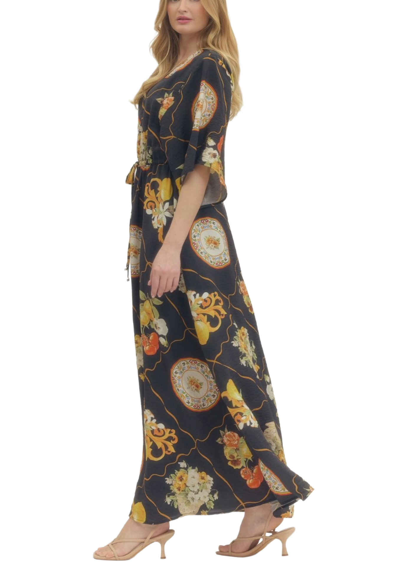 Printed short sleeve maxi dress featuring elasticated waist tie detail. Button closure at front. Lined. Woven. Non-sheer. Lightweight.